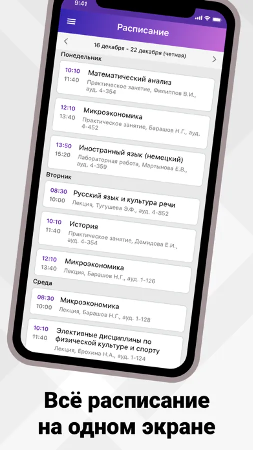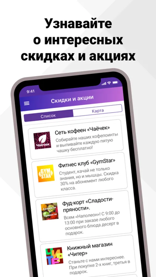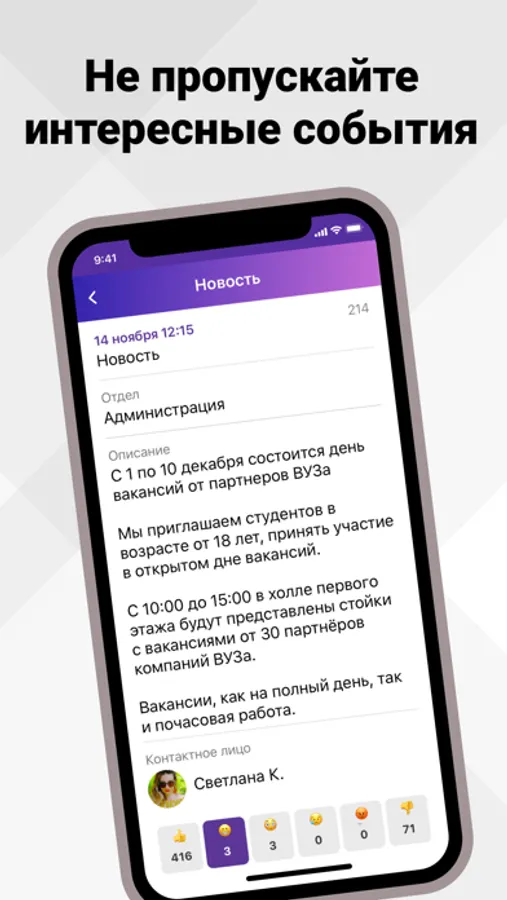 Раздел и уведомления о новостях и событиях в ВУЗе, с возможностью записаться на мероприятие или оставить на него реакцию.