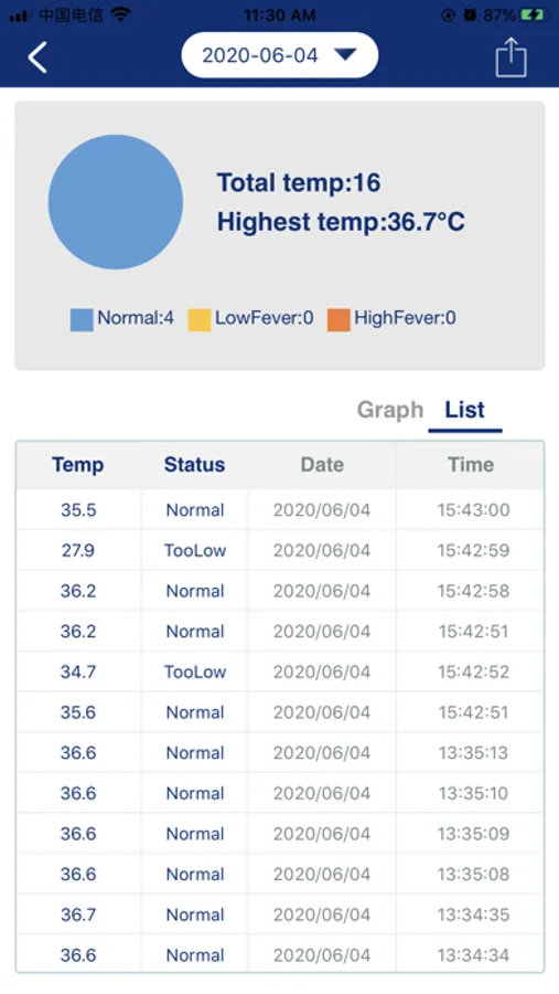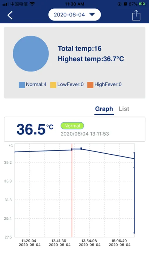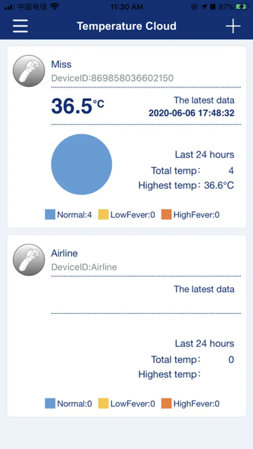 It can communicate with the external intelligent temperature measuring device through the mobile phone Bluetooth function, or directly scan the QR code of the external intelligent temperature measuring device for communication after being added, which can be used for temperature measurement and record the historical temperature data.