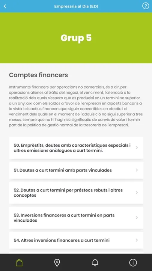 L’usuari disposa del Pla General Comptable andorrà ordenat per grups comptables fins a un nivell de detall de 3 dígits, amb la informació de cada grup (definicions i relacions comptables), així