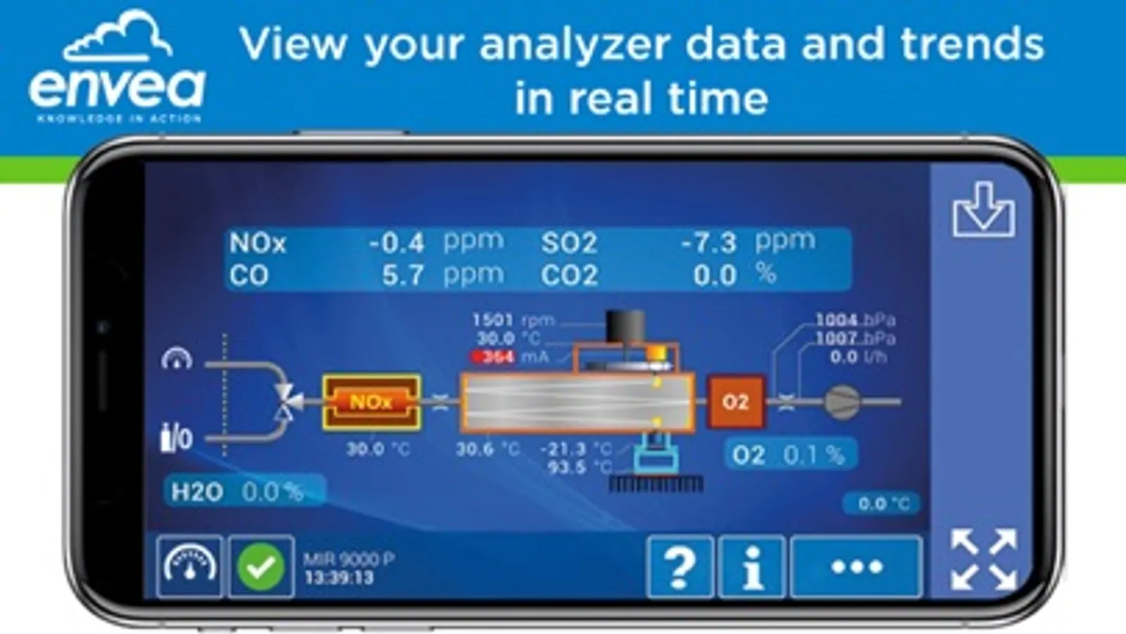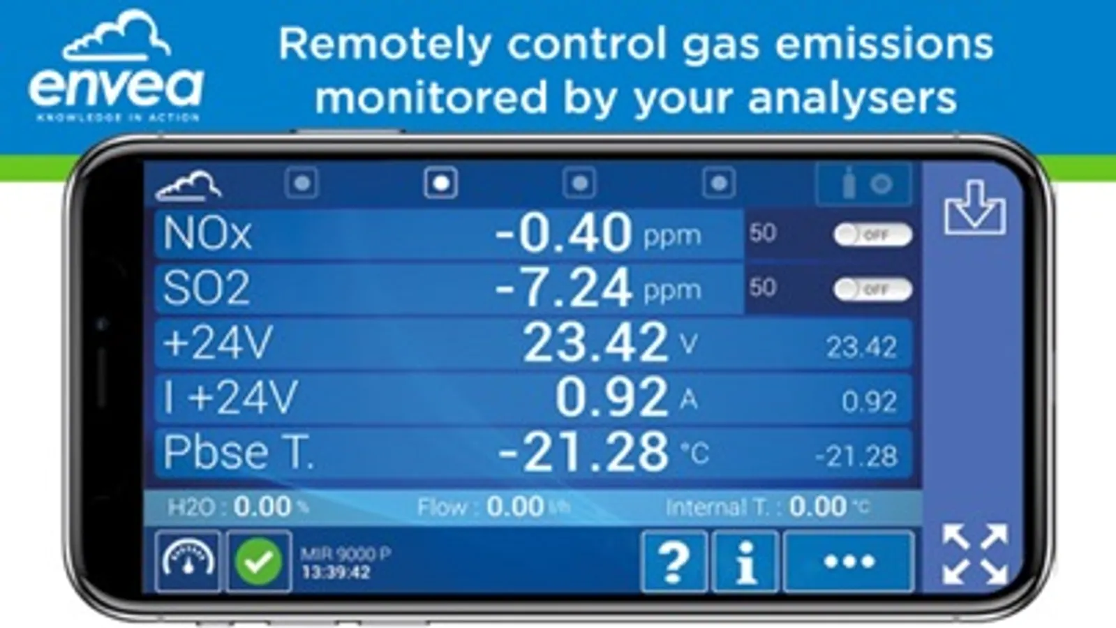 With the ENVEA Connect™ app and your smartphone's display the analyzer's screen is no more a necessity: adopt the NO-SCREEN version of the analyzer; the electrical consumption of the analyzer is further reduced and the additional pollution related to the screen manufacturing and recycling cycle is avoided.