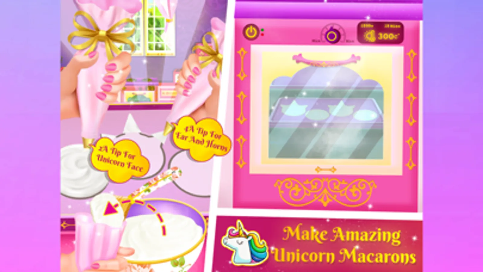 Hoorray! Let’s get ready to cook and bake some yummy delicious Princess themed Unicorn -Inspired desserts, some delicious Princess Unicorn Macarons. Get ready for the super fun food making game and be the best Unicorn Chef! This game will have variety of Unicorn Desserts, Like, Unicorn frost cake with surprise money, Sweet unicorn cotton candy, Unicorn pizza, Unicorn rainbow ice-cream rolls etc. Stay tuned for that! As of now, we are making and baking Princess kawai unicorn macarons, if you love to cook and bake, this is the best cooking game for girls who like cake and bakery games. It has real recipes with proper guidelines and steps. If you are a cooking lover and baking lover, this is the best food making game for girls.