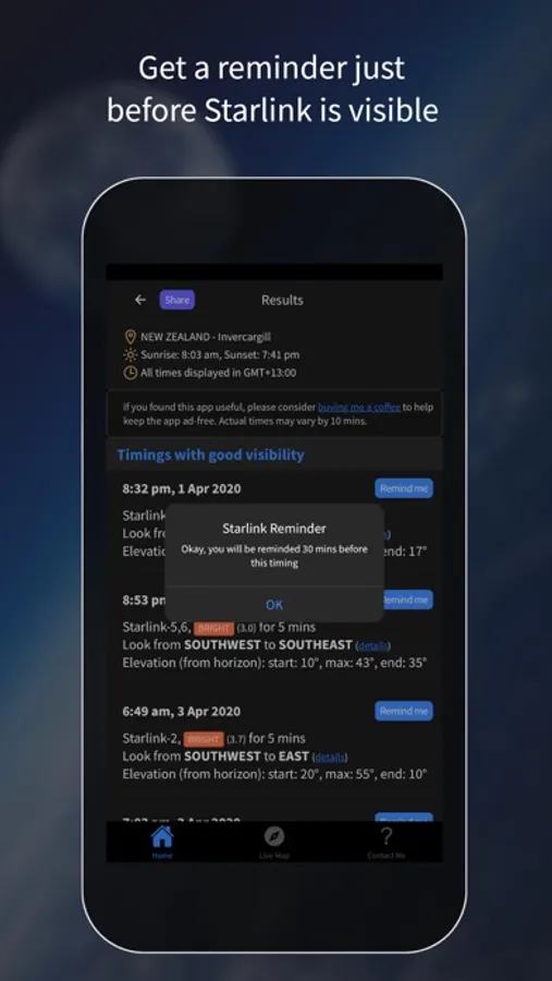 Designed to be simple and easy to use. First, please select your nearest city (or coordinates), and click on 'Find Visible Times'. The app will list the times when you can see Starlink. You can also click 'Remind me' next to any timing, to get a reminder 30 minutes before Starlink will be visible at your location. A 'Live Map' lets you track where Starlink is currently in the world.