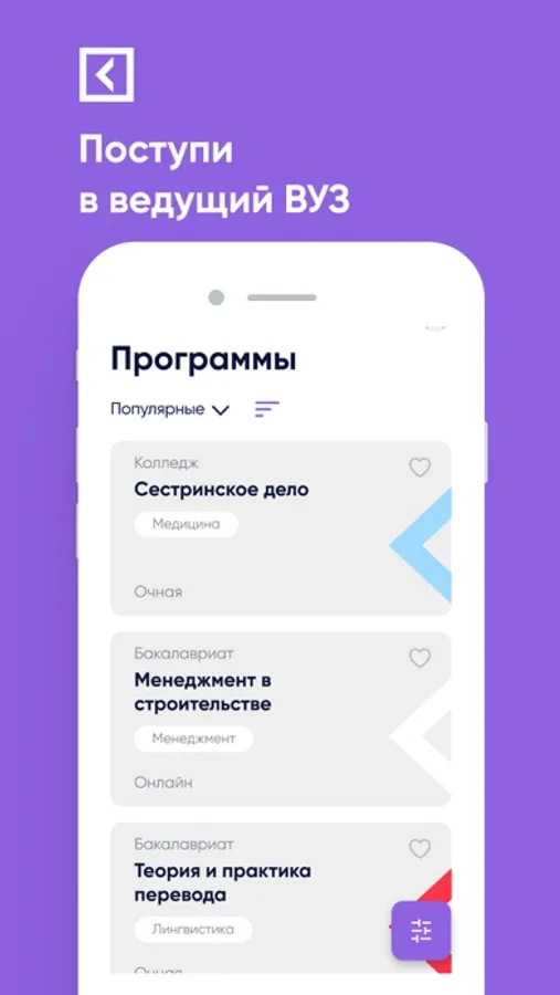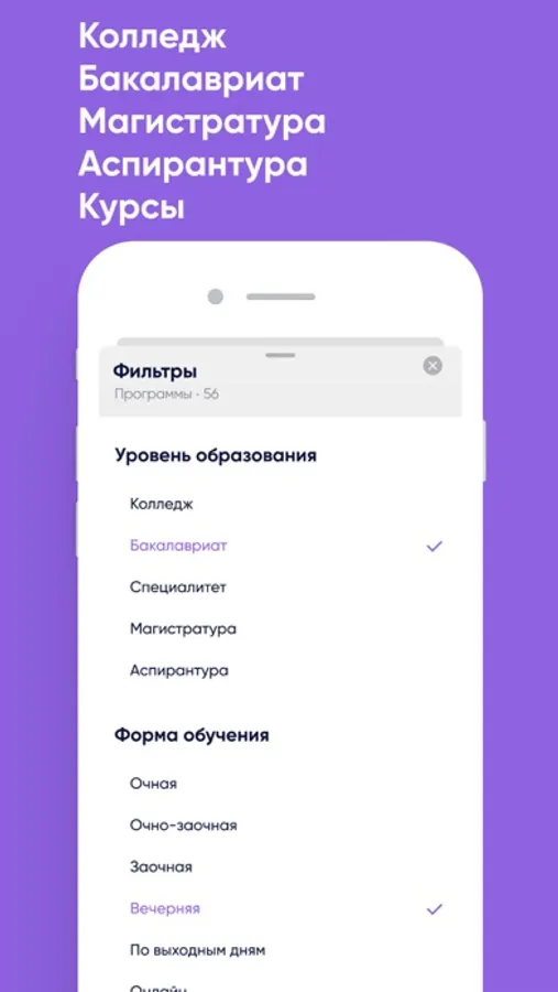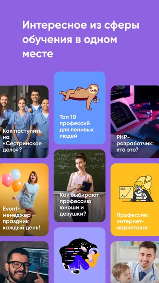 В приложении доступны 22 направления обучения, среди них: медицина, IT, строительство, юриспруденция, педагогика, менеджмент, маркетинг, дизайн, психология. Ищите направление, которое вам близко и выбирайте программу.