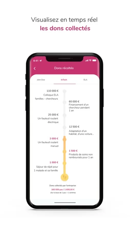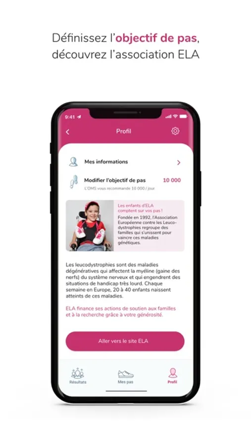You can use it to participate in the solidarity campaign to raise awareness (and potentially funds) for the children of ELA.It allows you to count your own steps and know the collective steps of your group, which is even more motivating! The principle is simple: take as many steps as possible for children who unfortunately can no longer use their legs. It allows you to share your commitment on social networking sites, and if you wish, to transform your steps into donations for the children of ELA.