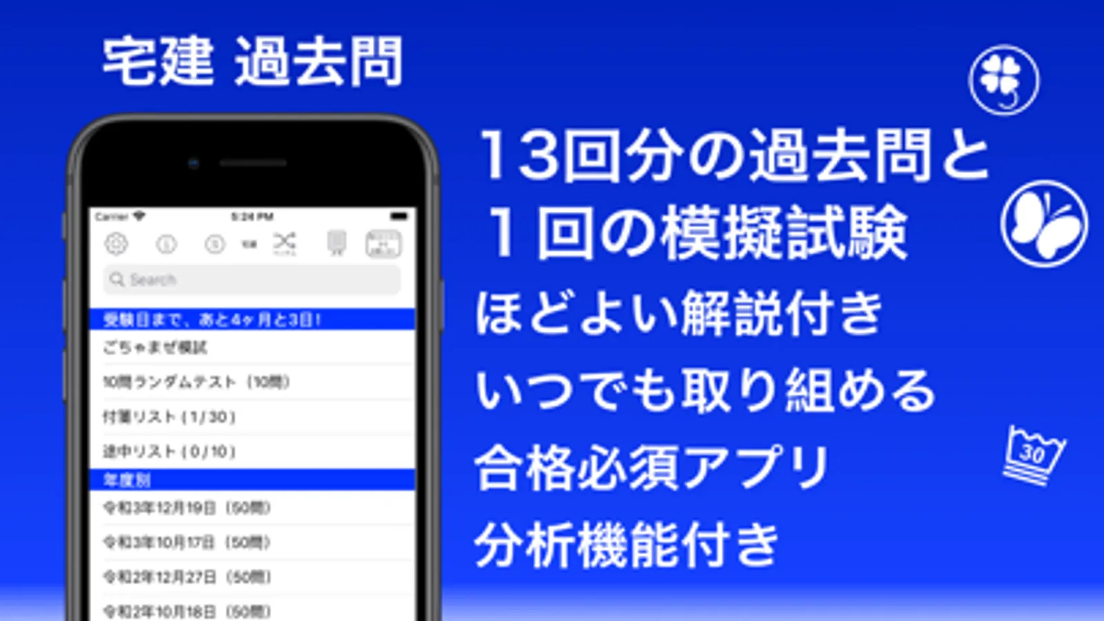 宅建の過去問をアプリ化。最新の問題を掲載し、ほどよい解説付き。過去問検索やマイリスト機能。10問テストなど、受験したときにあったら良かったと思う機能を搭載しています。解説の間違いや、誤字、脱字などお知らせいただいた方には、広告表示をなくすことができます。
