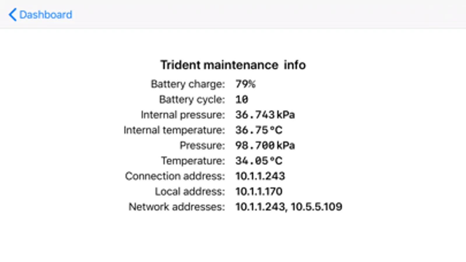 • Show maintenance data: internal pressure, internal temperature, battery cycle count