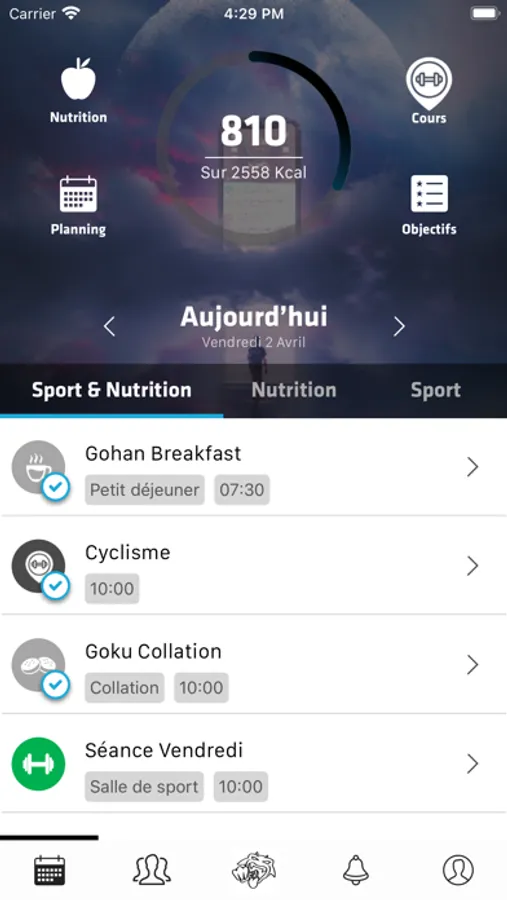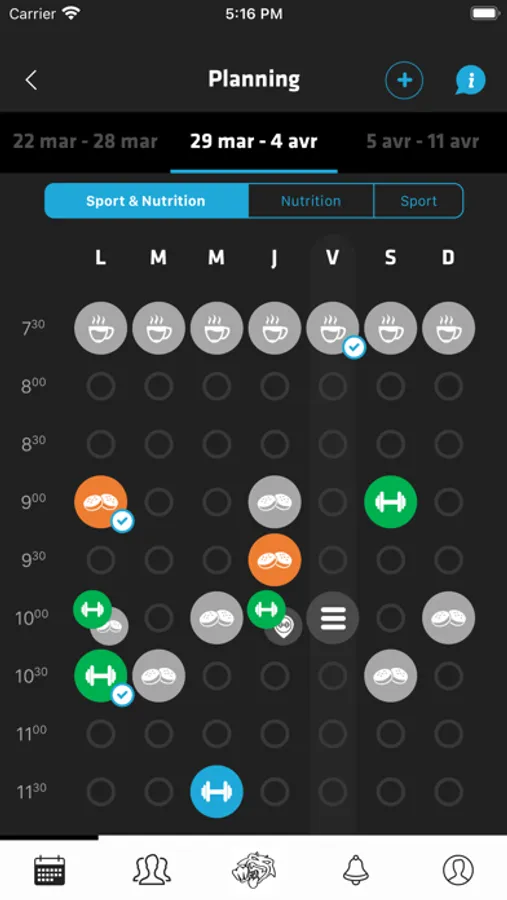 Sur celui-ci vous retrouverez la planification de vos repas et séances créés en amont par votre coach, en réponse à vos objectifs. Dans votre planning vous pourrez ajouter vous-même les programmes sportifs et nutritionnels conçus par votre coach.