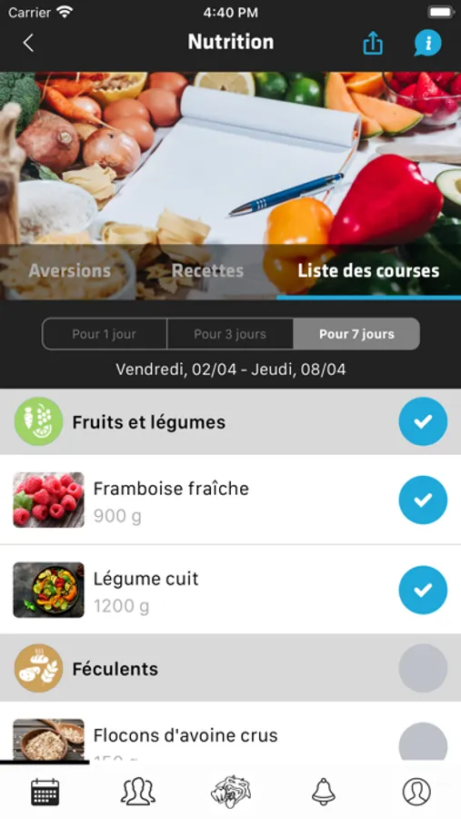 L’onglet nutrition + permettra de renseigner vos aversions alimentaires, que vous pourrez ensuite partager à votre coach. Des variantes des aliments vous seront proposées pour remplacer ces mêmes aliments sélectionnés. Vous aurez également accès à la liste de vos recettes et enfin à votre liste de courses qui s’adaptera tout autant, en temps réel, aux repas ajoutés à votre planning.