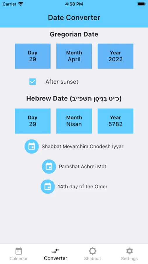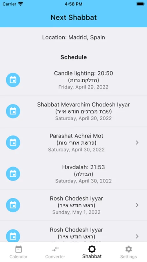 Calendar, Shabbat and Candle lighting times for any year, past or present.