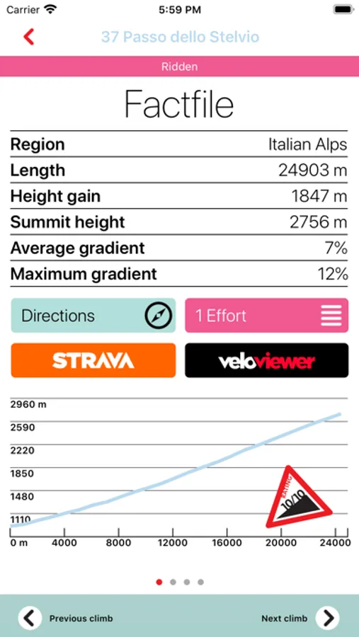 Via the interactive map you can locate and be instantly directed to the base of each climb and then be taken to it’s fact file where you will see its vital statistics, comprehensive directions and also links to view the segment on Strava and Veloviewer. Strava subscribers can quickly and simply check their efforts on each one, compare times over the years and see how you compare to the world’s best riders many of which hold the KOM and QOM on these iconic roads. From the home screen you can also scroll through the list of climbs which can be sorted by difficulty, geographically, by ridden, or best of all, by which is nearest to your current location.