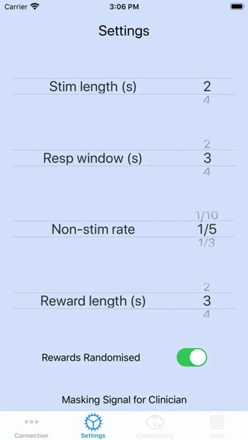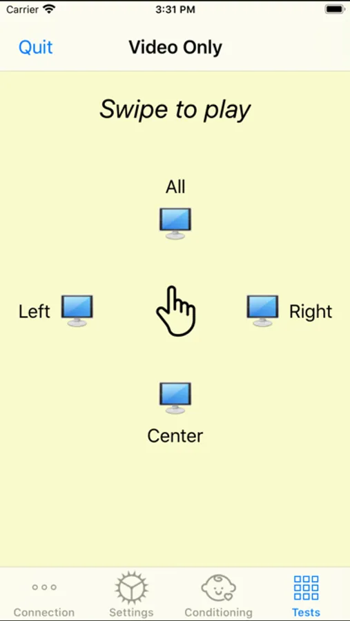 Conditioning Mode: The conditioning mode allows you to present rewards without linking to a presentation stimulus. This is designed to allow a tester to condition the child to receiving visual rewards in preparation for the test procedure. No data is stored from conditioning mode.
