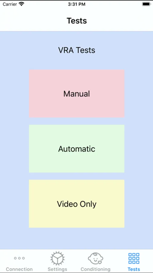 VRA Audiometry Control for the MedRx hardware. The iOS App allows control of the MedRx Studio VRA Module. The iVRA app has three test options: Conditioning, Manual Testing and Automatic Testing.