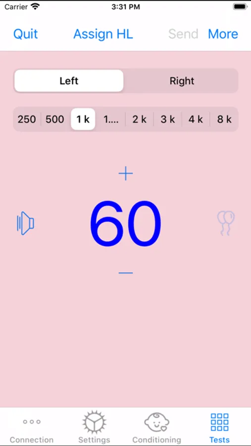 Manual Mode: The manual mode will allow for manual testing. You can choose level, frequency and ear in which you to present tones. Catch trial are still present in manual mode. Double tap the number to save a threshold. All data presented will store inside of the Studio log files when saving data. You must save the data for the thresholds to transfer into Studio.