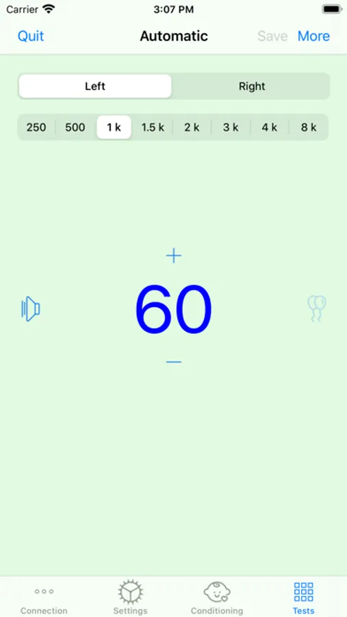 Automatic Mode: The automatic mode will allow for automatic testing. In this mode, you can select frequency and starting level. Once you present a tone for a frequency, the level will be adjusted automatically until threshold is determined for the frequency. Continue with next frequency until all desired testing is completed. All data presented will store inside of the Studio log files when saving data. You must save the data for the thresholds to transfer into Studio.