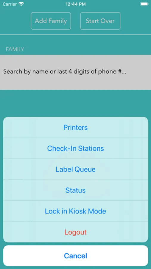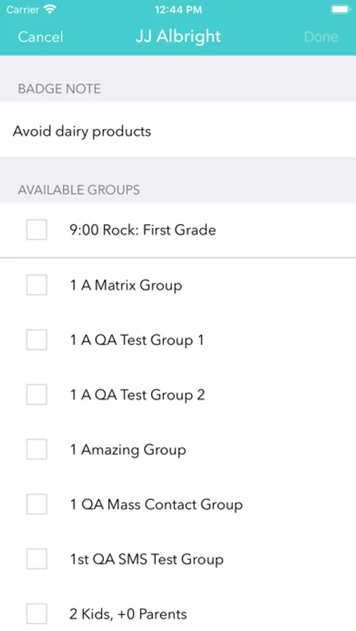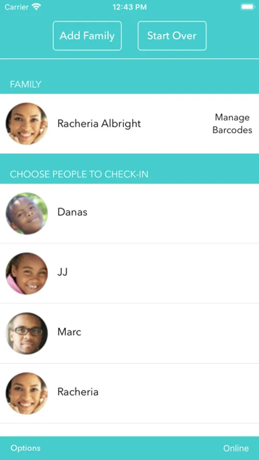 You can choose the group to check each person into, add new people and families, and edit the notes that print on the badges.