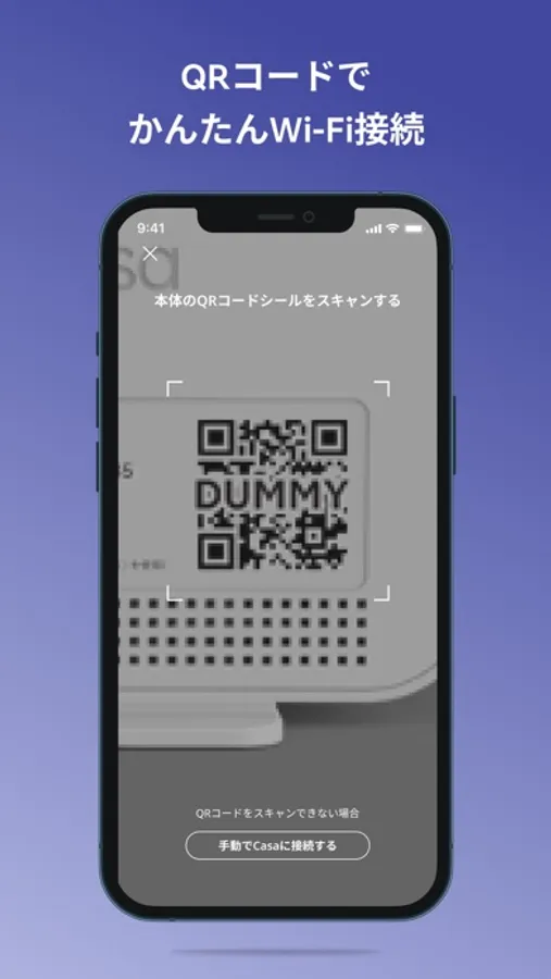 Scan the QR code on your Rakuten Casa device to connect to the Wi-Fi network without manually entering network name, password, serial number, etc.
