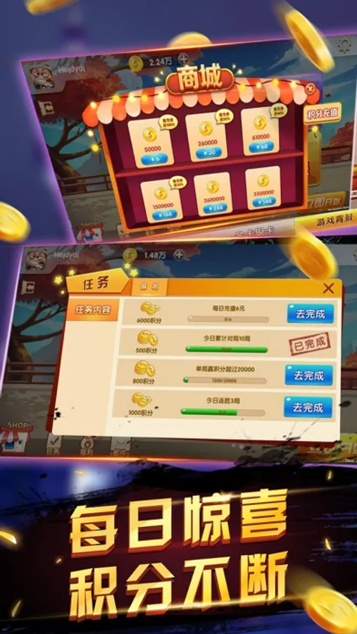 ● 每天登陆送豪礼,连续登陆送更多,诚意满满,积分不足自动发放,让您免费打牌