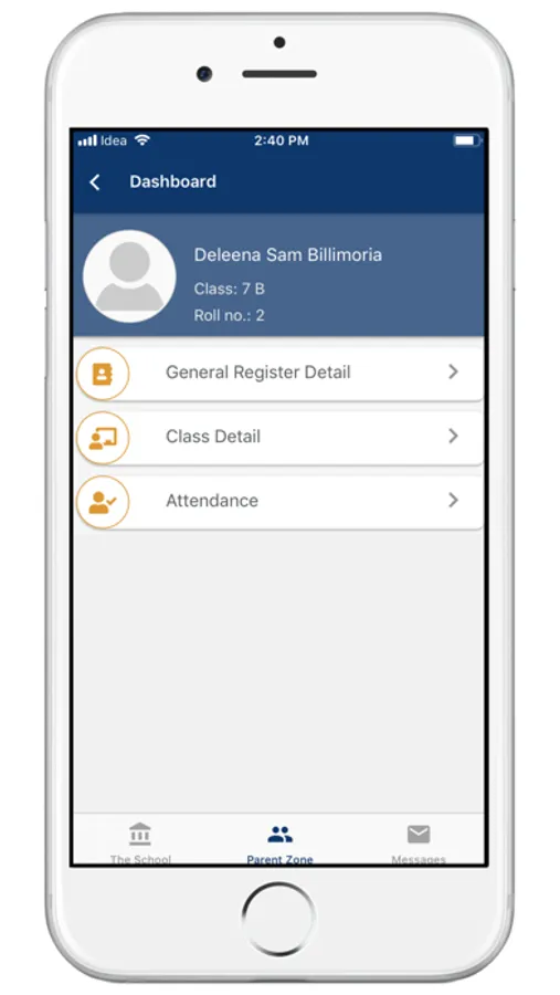 (2) Parent Zone - Parents can see their kid's personal records in this section. For example - General Register details, Time Table, Attendance etc. Parents will have to register into the app using the same mobile number which is supplied for school General Register record.