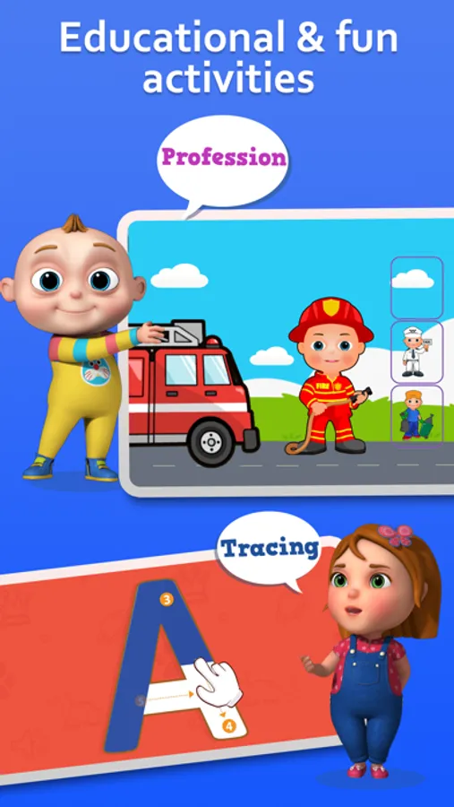 - Education Content - Educational games includes Memory Game, Joining Dots, Block Puzzles, Matching Letters, Coloring pictures, Tracing Alphabets, Feed the Animals, Match the Profession and many more.