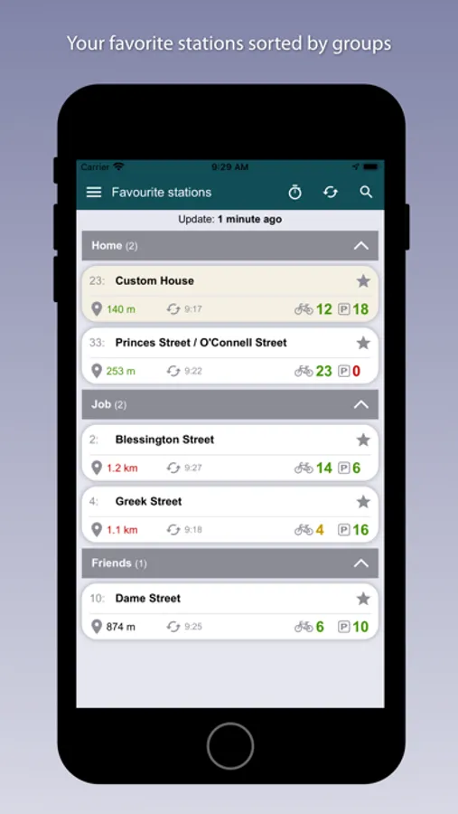 - List of favorite stations categorized by groups (home, work, friends or general).