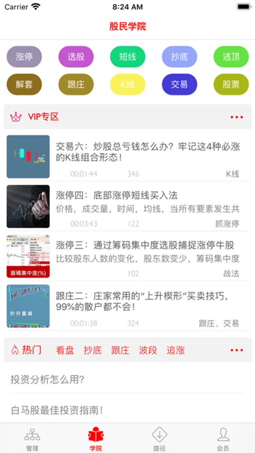 二、股民学院:股票入门、股票知识、股票术语、炒股技巧、选股技巧、买入技巧、卖出技巧、短线技巧、看盘技巧、跟庄技巧、炒股经验、投资策略、技术指标、K线图、均线、分时图、成交量、波浪理论、MACD、KDJ、江恩理论、趋势线、基本分析、财务分析、心理分析、解套方法、涨停研究、黑马捕捉、资金仓位、波段操作。