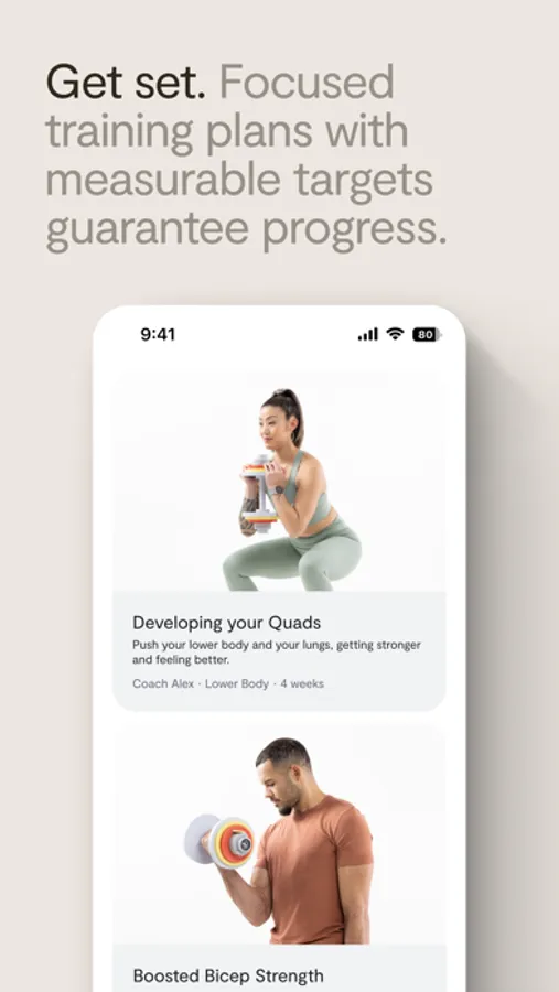 Your training with Tempo will guide you through a 4-week plan of your choice, working to get you from a baseline weight to a new personal record. Plans are designed to focus your effort on a targeted muscle group, while also working your full body. At the end of your plan, choose a new one for an entirely new challenge.
