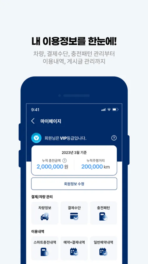 차량, 결제수단, 충전패턴 관리부터 이용내역, 게시글 관리까지