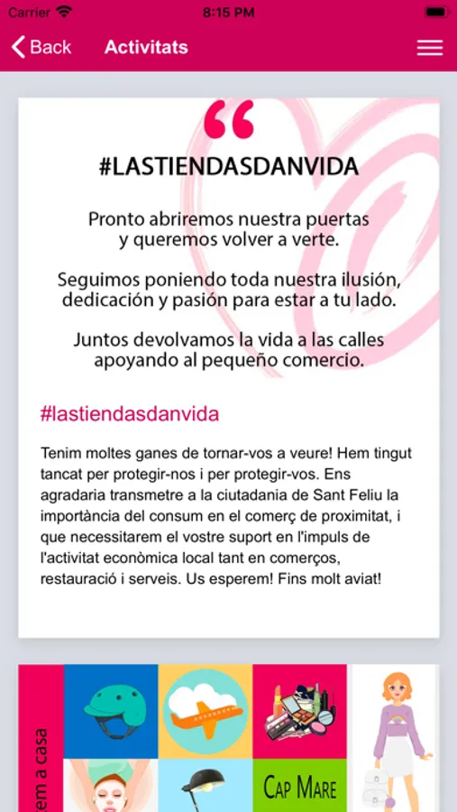 The Application can be used without having to be registered. In this case, users will have access to the list of establishments in the municipality of Sant Feliu that have joined the campaign, of which relevant information is provided so that users can easily find what they are looking for and make any purchases in-person.