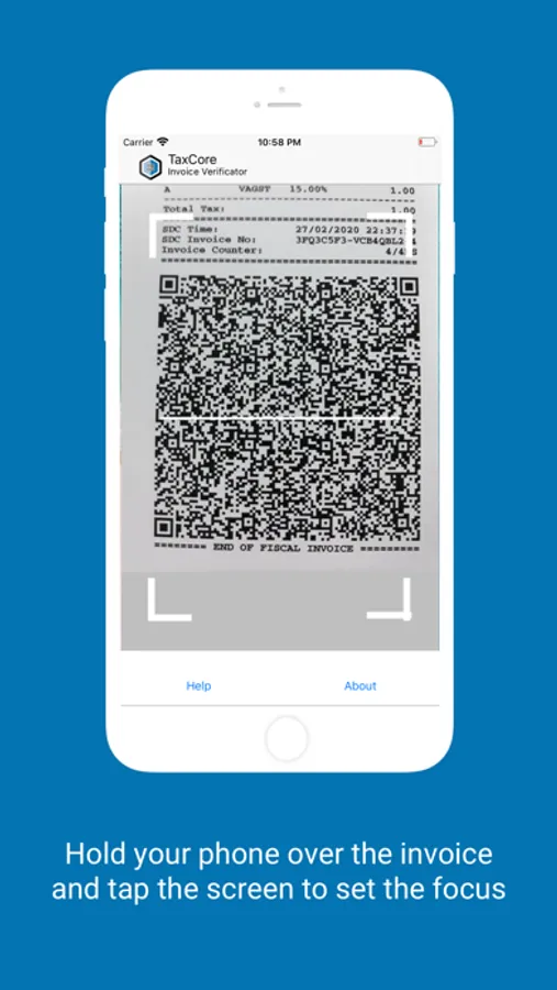In order to scan a QR code, open the TaxCore Invoice Verificator and hold the camera over the QR code. You don't need to take a photo or tap a scan button - the app will automatically recognise the QR code. If the code contains a valid URL, it will automatically take you to the TaxCore website where you can check the invoice status. If the QR code contains an invalid URL, the app will display an error message giving you the option to try again.