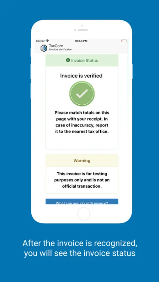 In order to use the TaxCore Invoice Verificator, make sure you are using a phone with a built-in camera. In addition, in order to verify the receipt, after scanning a QR code, make sure your device is connected to the Internet.