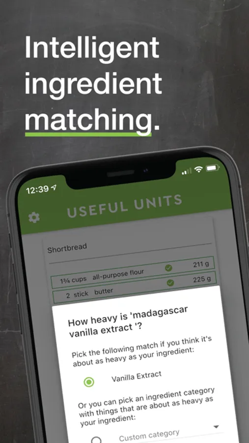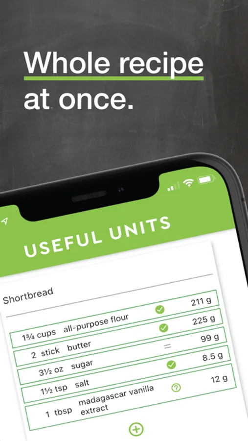 A recipe in cookbook or on your favourite blog? Useful Units isn’t picky: Take a picture of the recipe or just load a screenshot of it. Text recognition is automatic! Adjusting or adding ingredients manually is super easy, too.