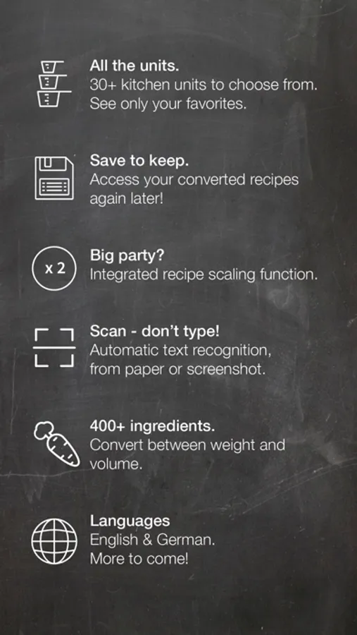 Simply take a picture from a cookbook or a screenshot from a digital source - and the app does all the work for you: it automatically reads the recipe and instantly converts it into your preferred units.