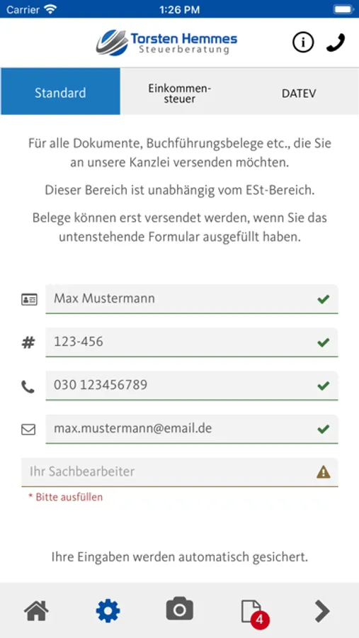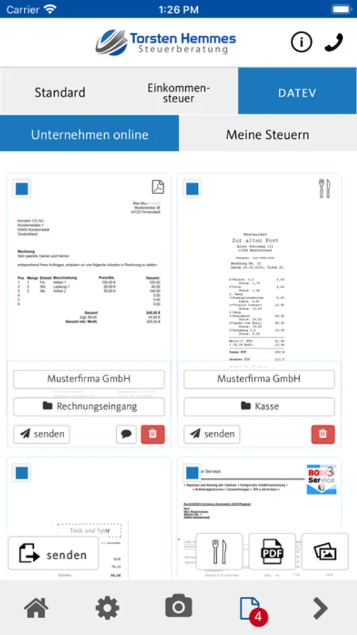 Fotografieren Sie hierzu einen oder mehrere Belege und versenden Sie diese mit einer sicheren Verschlüsselung direkt aus der App heraus an uns!
