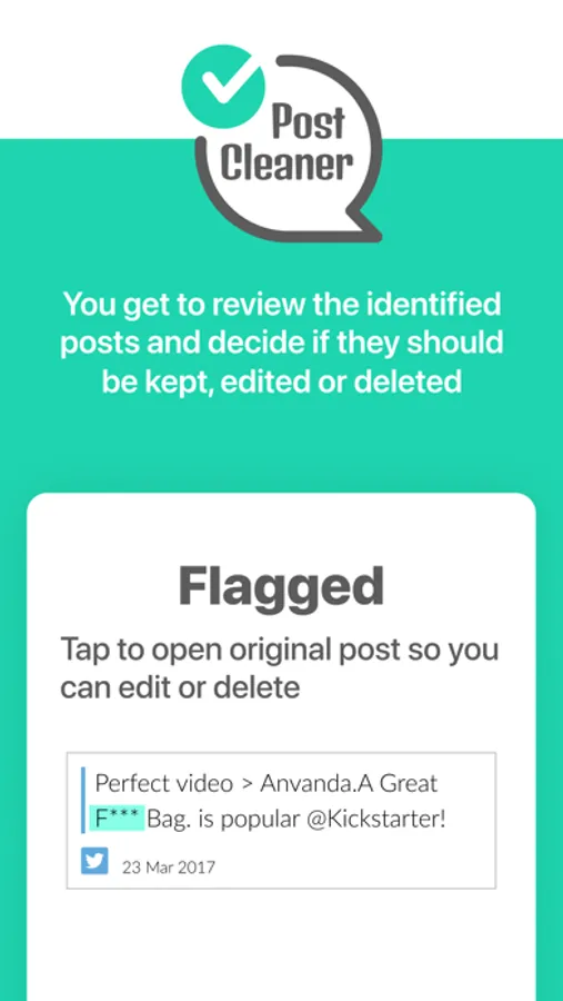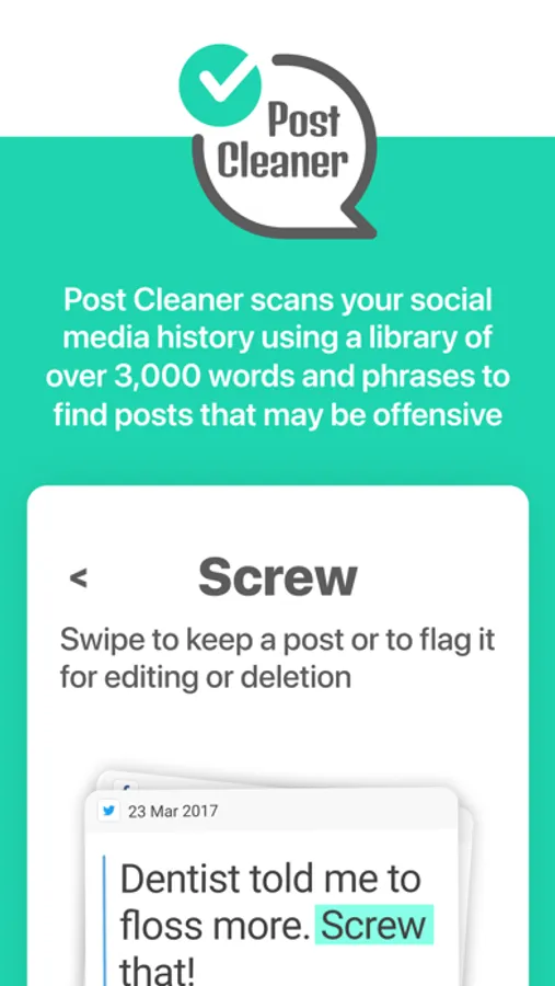 Post Cleaner privately analyzes your social media posts and identifies potentially offensive content. Profanity, vulgar phrases, and other objectionable language are identified, and then a left/right swipe function allows you to quickly sort through flagged content to dismiss or mark for editing.