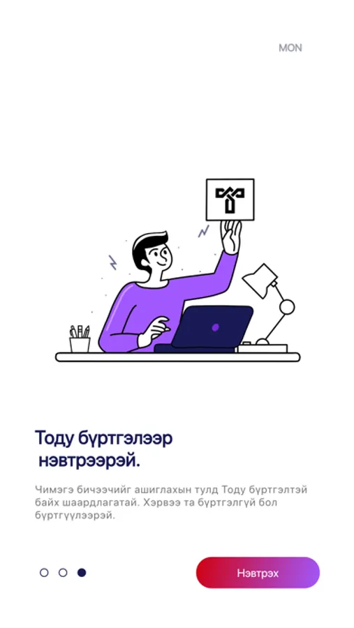 • Нэвтрэх/бүртгүүлэх: Болор бүртгэл™ байхгүй бол эхлээд Болор бүртгэл авна. Бүртгэлтэй бол Болор бүртгэлээрээ нэвтэрнэ.