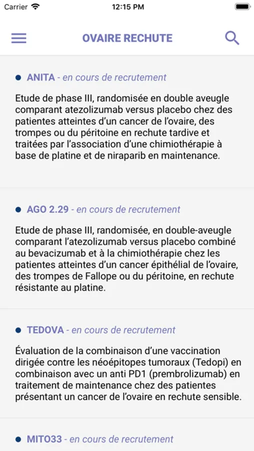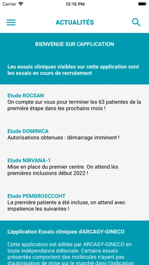 Les informations contenues sur l'application ARCAGY-GINECO sont destinées aux professionnels de santé, acteurs de la recherche clinique en cancérologie gynécologique. Les conditions d'utilisation de l'application ARCAGY-GINECO sont régies par la loi française, ainsi que les règles de fond et de forme. Toutes les informations contenues sur l'application ARCAGY-GINECO ont été vérifiées, validées et documentées. Les sources documentaires, le cas échéant, sont disponibles, sur demande.Les informations contenues dans l’application sont susceptibles de ne pas être approuvées par les autorités de santé et ne doivent pas être mises en pratique. Pour toute information, contactez ARCAGY