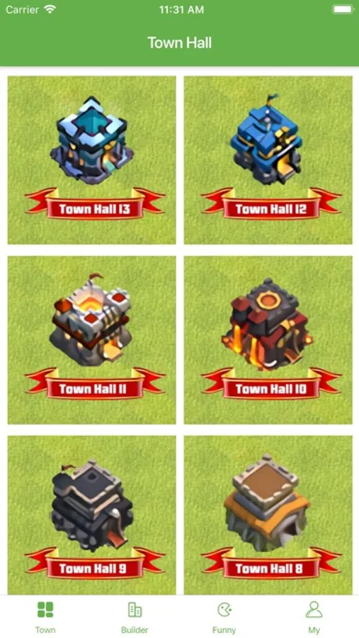 Town hall levels TH1, TH2, TH3, TH4, TH5, TH6, TH7, TH8 , TH9, TH10, TH11, TH12, TH13.