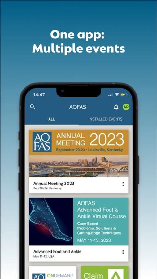 AOFAS Society App is the portal to all events, meetings, and activities from the American Orthopaedic Foot & Ankle Society. Registered attendees may log in to access abstracts and meeting agendas, browse ePosters and handouts, claim CME, and view other presentation and speaker information.