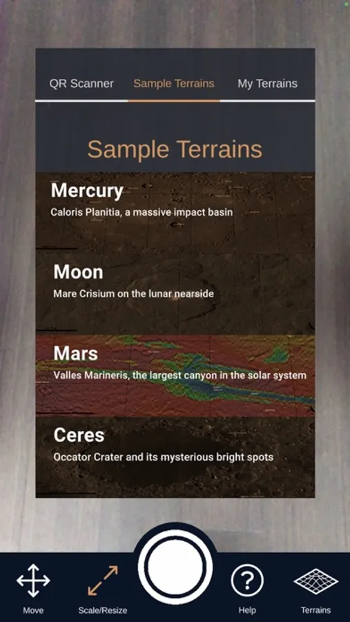 Prepare terrains in JMARS 5, and scan the generated QR code to see custom-generated terrains.