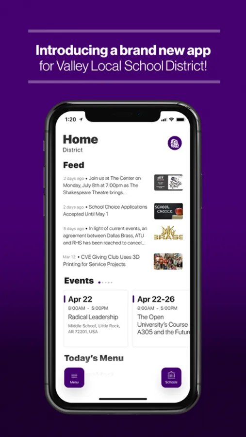 The event section shows a list of events throughout the district. Users can add an event to your calendar to share the event with friends and family with one tap.