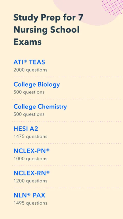 Nursing School Pocket Prep gives you access to study prep for 7 different nursing school exams all in one place, with 500-2000 practice questions for each exam.