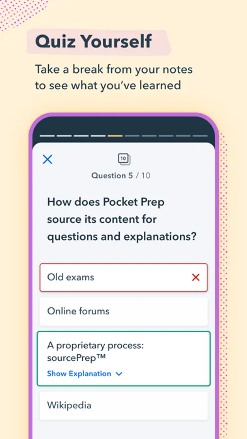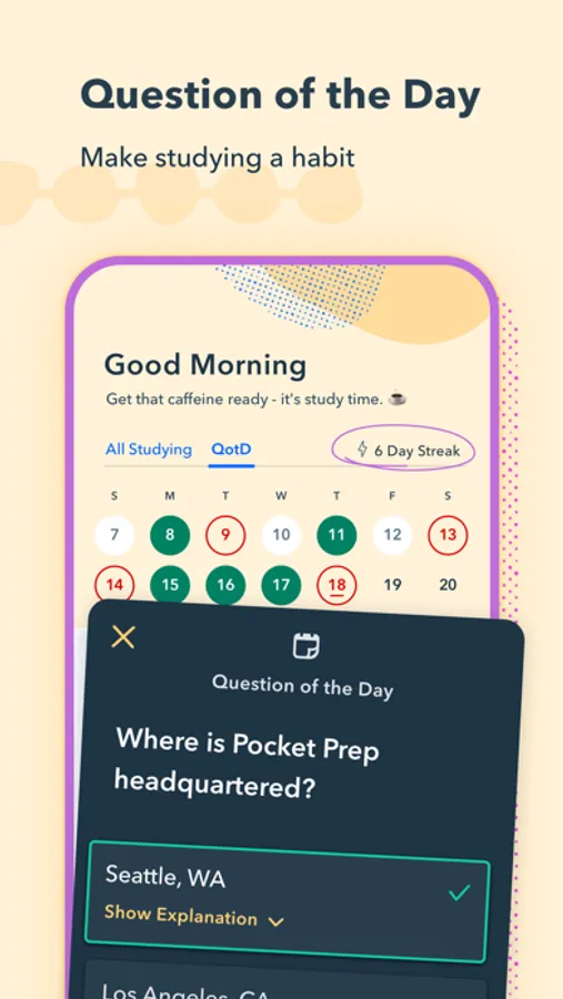 Scientific research shows that studying in short bursts over time is more effective than a handful of long study sessions. Our app is built with this in mind, giving you the power to study from your phone whenever and wherever it's convenient for you. Easily access practice questions while waiting in line, on public transit, on meal breaks, and more!