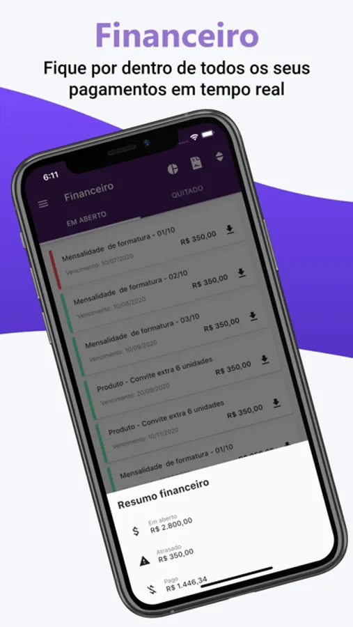 - Gestão financeira (cobranças abertas com linha digitável e pagamentos realizados)