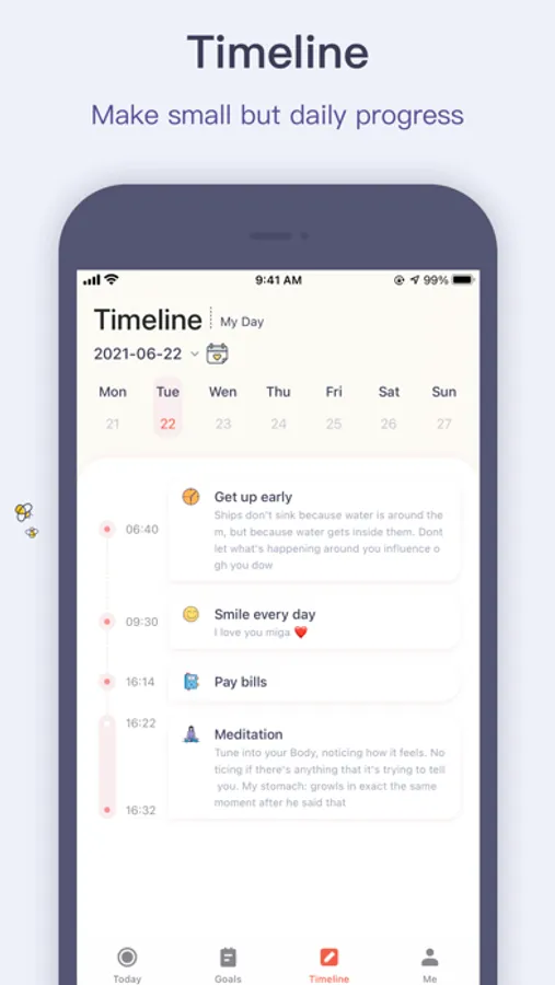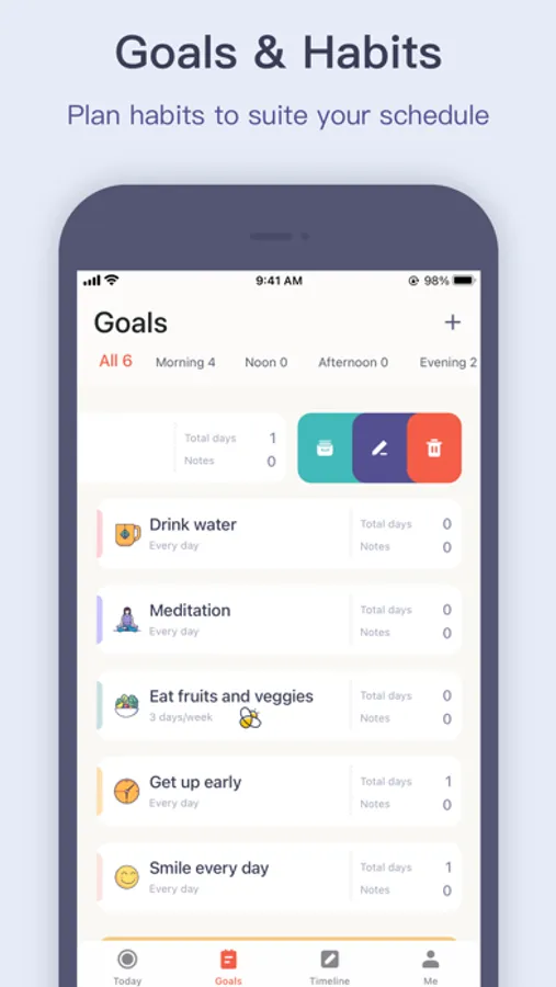 Timemory is a free and easy-to-use tool that helps you build a routine of positive, life changing habits. Set personal goals, track your progress, and motivate yourself to achieve new heights!