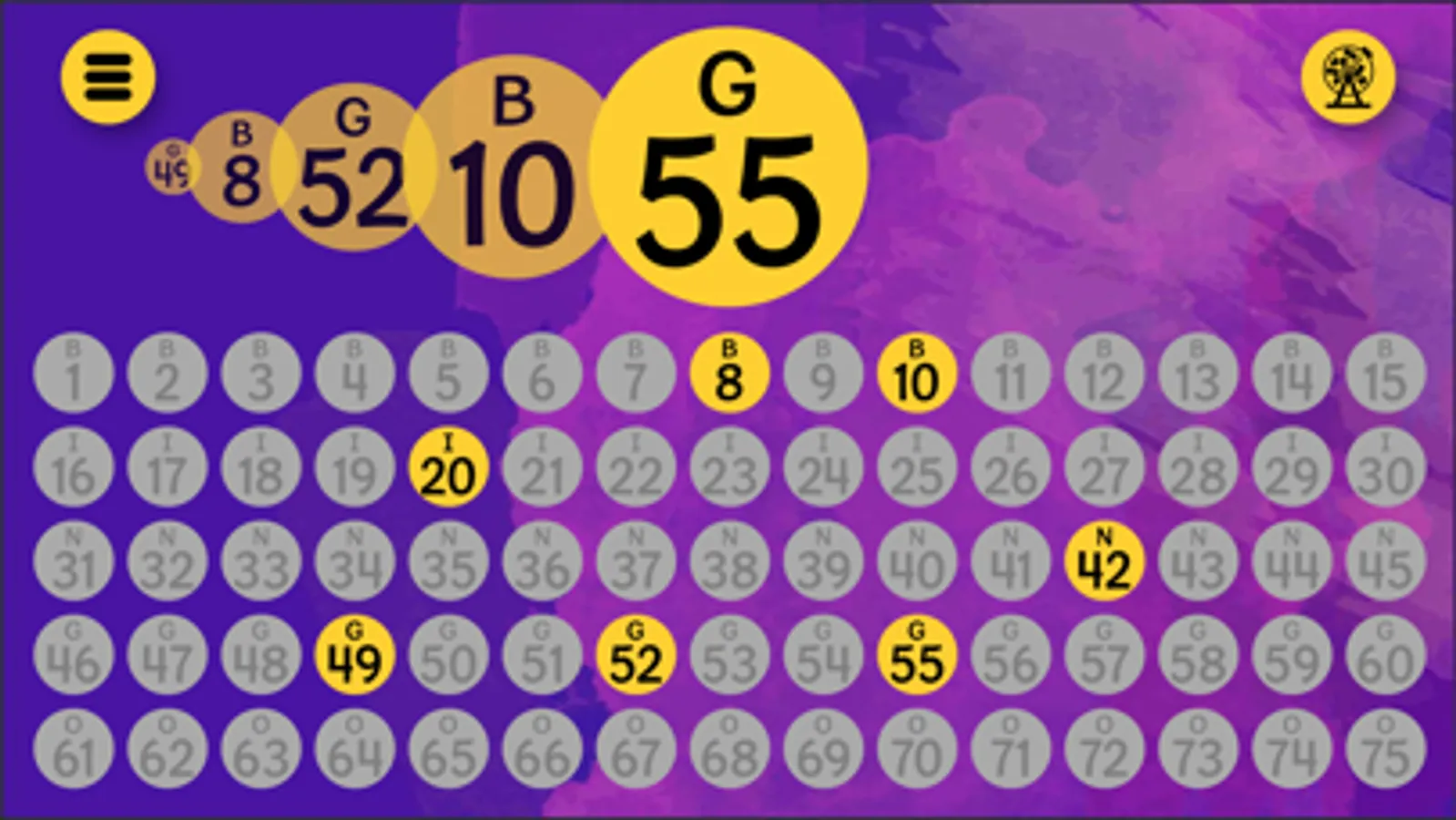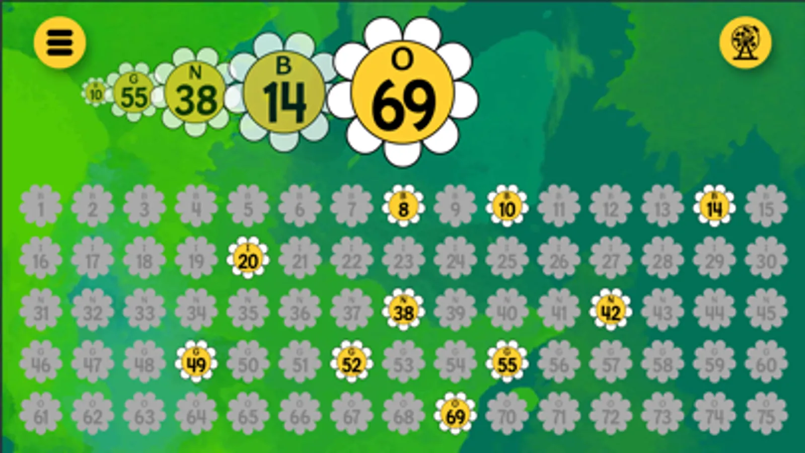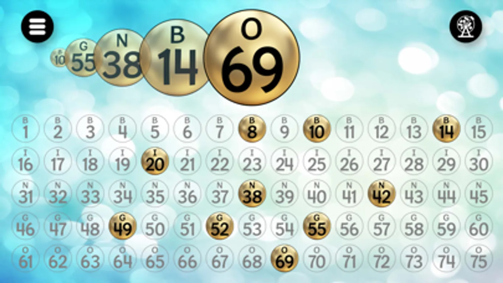 Bingo Caller+ adds seasonal and holiday themes for Christmas, St. Patrick's Day, Valentine's Day, New Year's, Halloween, springtime, bowling. It's designed to display called Bingo numbers for a family game night, small gathering, or large group Bingo game. You can mirror the screen to an Apple TV, output to a projector via HDMI, share the app window to a group video app, or just show it on from your device. You can have the app pick random numbers or tap and untap numbers chosen from your Bingo ball picking cage. The app can optionally say the numbers aloud. Controls are simple -- tap bingo balls or tap the random button.