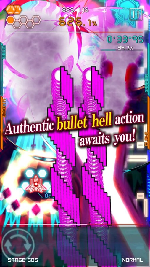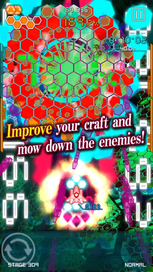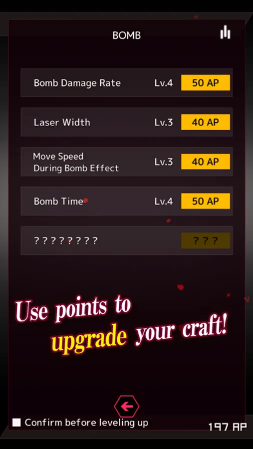 There are many level up options to strengthen your craft: shot power, shot speed, bomb duration, and more. Upgrade your craft and blast through the stages.