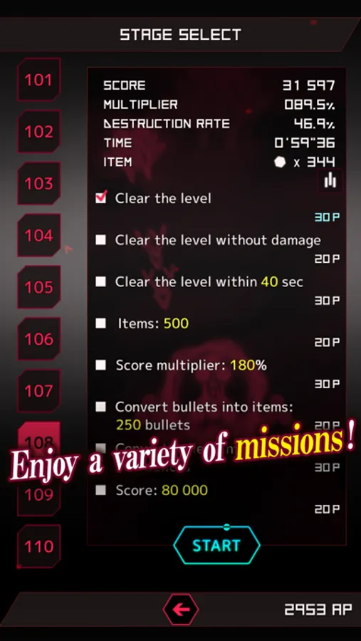 Various missions await you in each stage -- from simple to challenging ones. Clearing missions like “Defeat 30 enemies!” unlocks a boss stage. Defeat the boss to proceed to the next chapter.