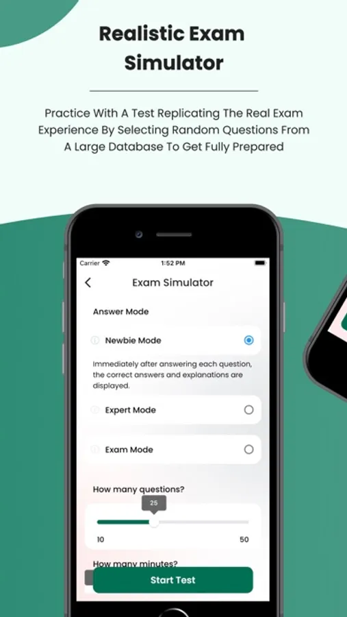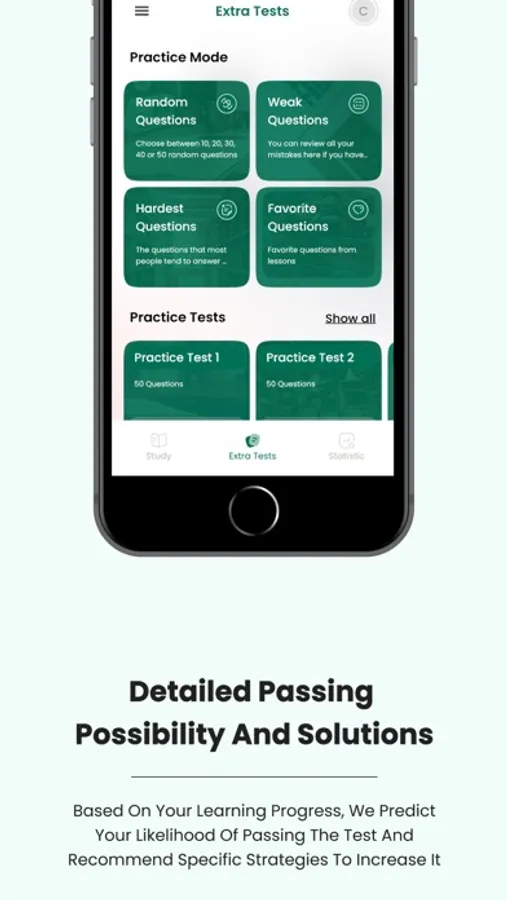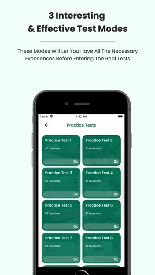 • Mock test: Mock test simulates the real test format. When you finish the test you will see your score and review all the questions.