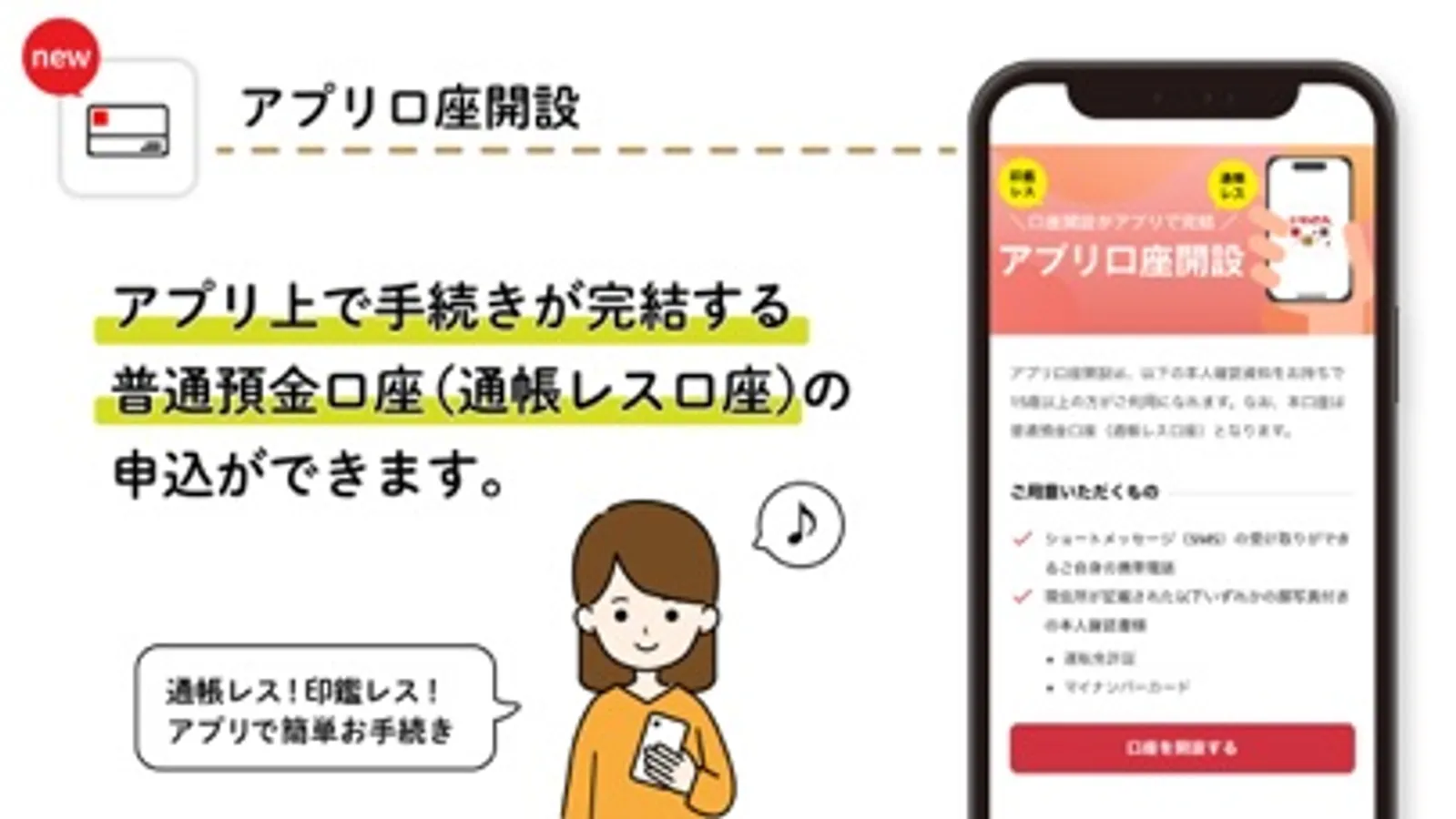 振込や定期預金取引等の従来の機能に加え、アプリから普通預金口座開設もできるようになり、ますます便利にご利用いただけるようになりました!
