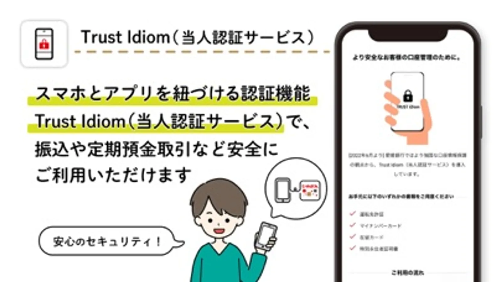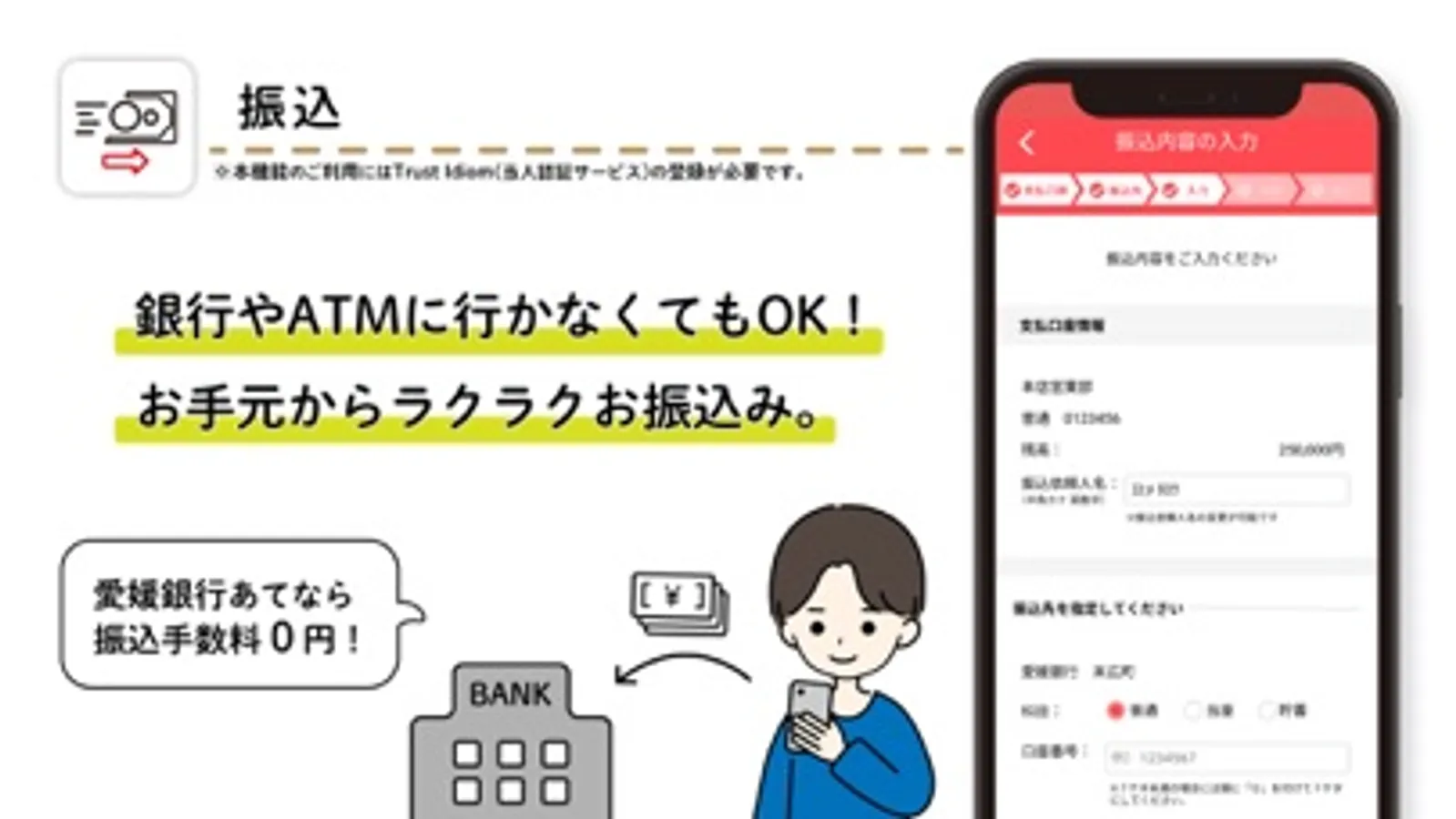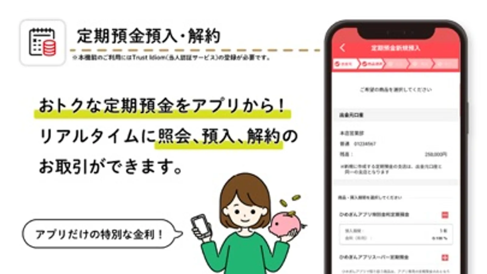 ※下記対象取引をご利用いただく際は、セキュリティ強化のため、Trust Idiom(当人認証サービス)の登録が必要になります。TrustIdiomとは、ひめぎんアプリと端末機に登録された当人認証情報を紐づける当人認証サービスです。